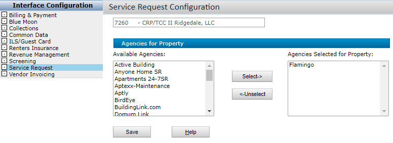 If you want to configure a list of properties, you can go into Interfaces > Configuration > Bulk Property Interface Configuration > Enter a property list > Select Service Requests > Select Flamingo and Save.